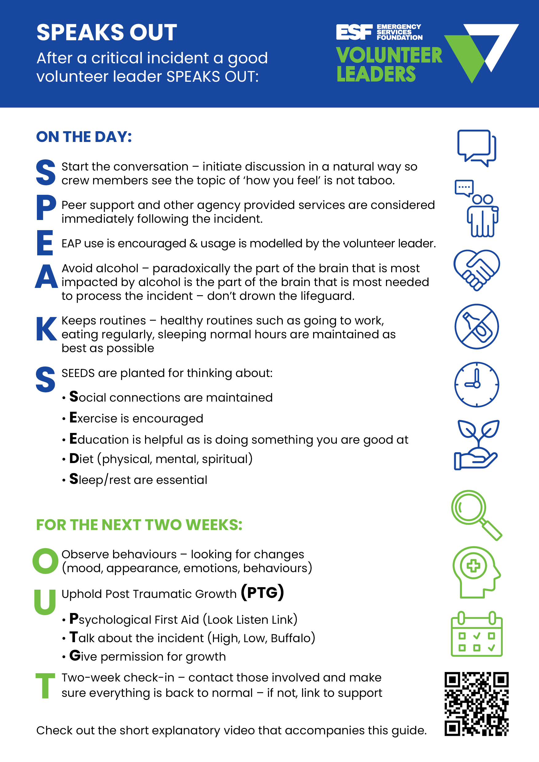 The Speaks Out resource was developed as an outcome of the Volunteer Leader program. It is designed to help volunteer leaders look after their volunteers after a critical incident, to foster psychologically safe and mentally healthy teams.